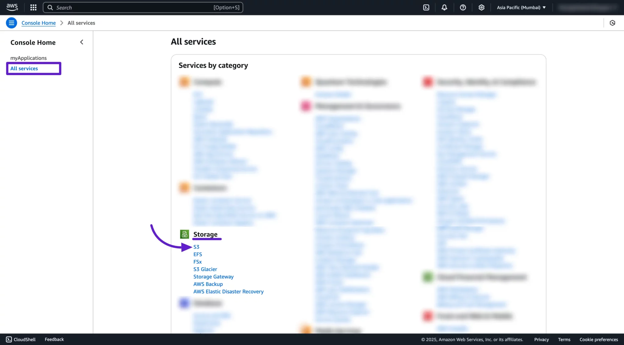 From the Dashboard, click on All Services in the left sidebar. A full list of AWS services will appear—scroll down to the Storage section and select S3 to proceed.