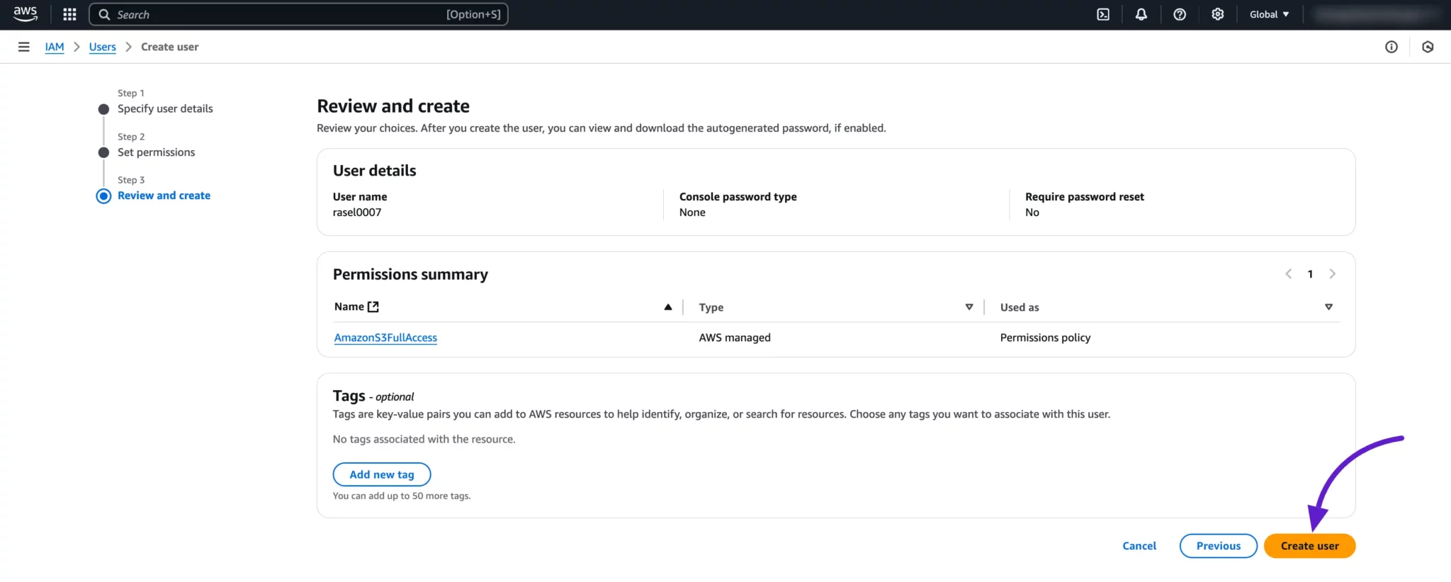 You can skip the Review and Create step and click on the Create User button to create the new user.