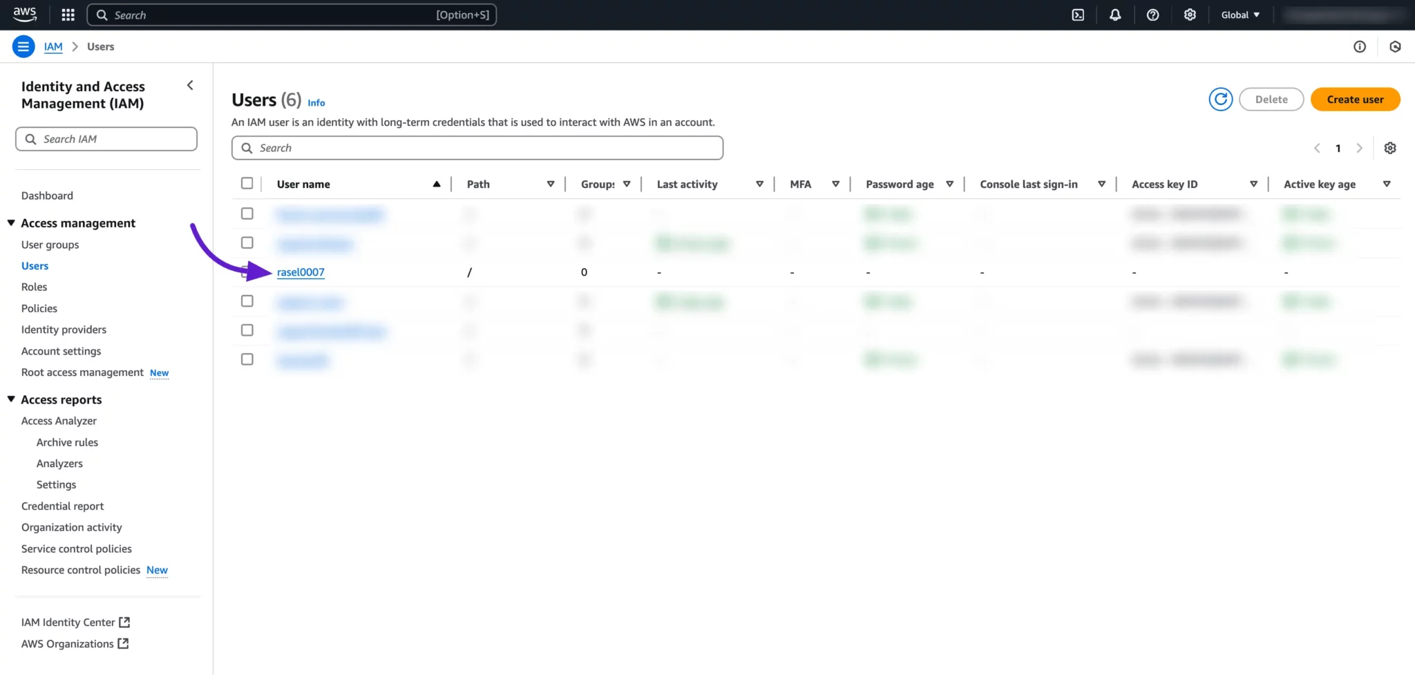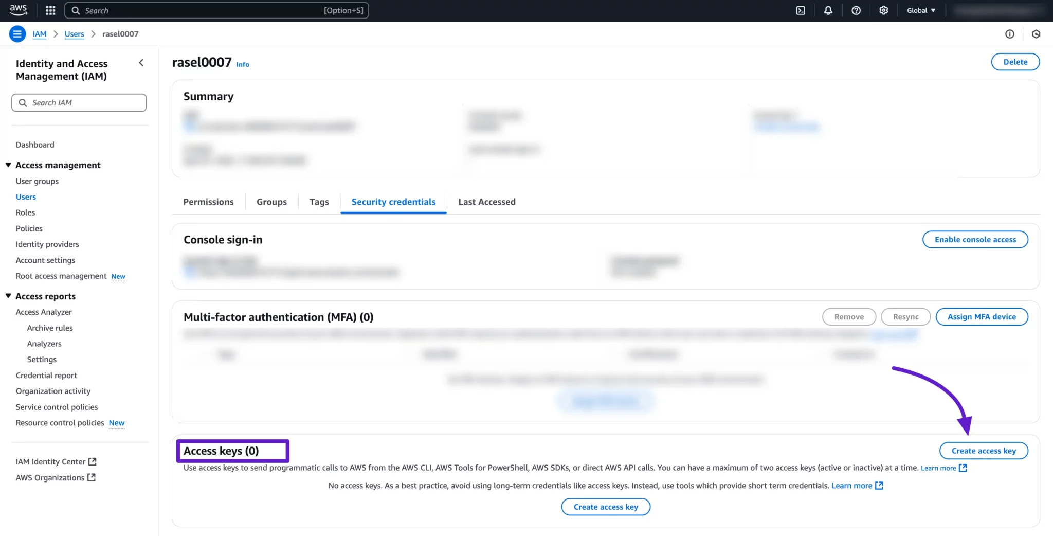 Now, go to the Security Credentials tab from the User Details page. Under this tab, you will find the Access Keys section. Click on the Create Access Key button to generate new access credentials for the user.