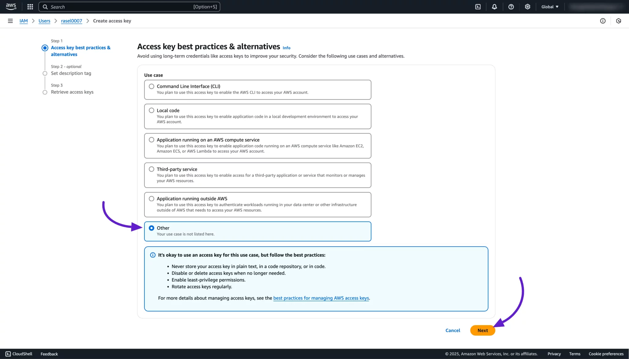 The steps to create Access Keys will appear. In the Access Key Best Practices & Alternatives step, select the Other option and click on the Next button to proceed.