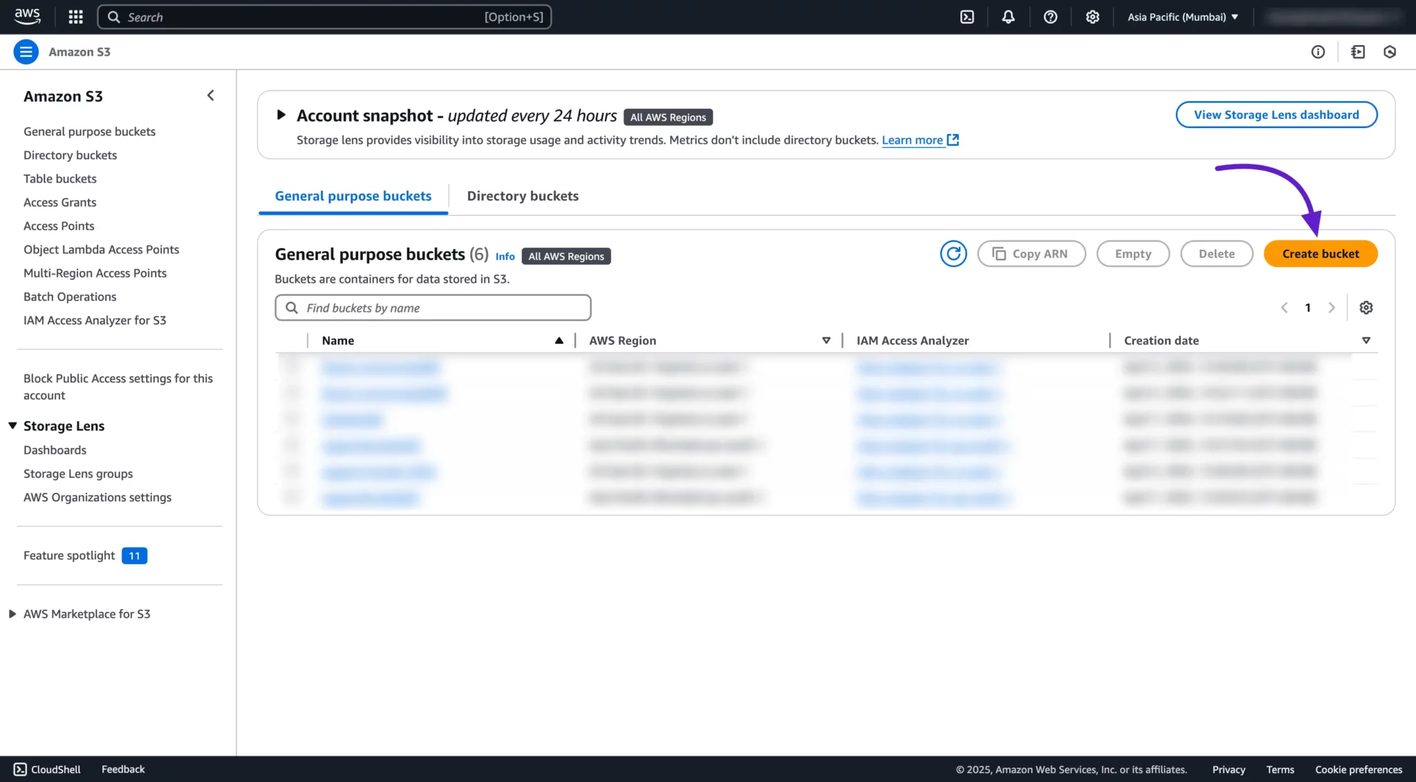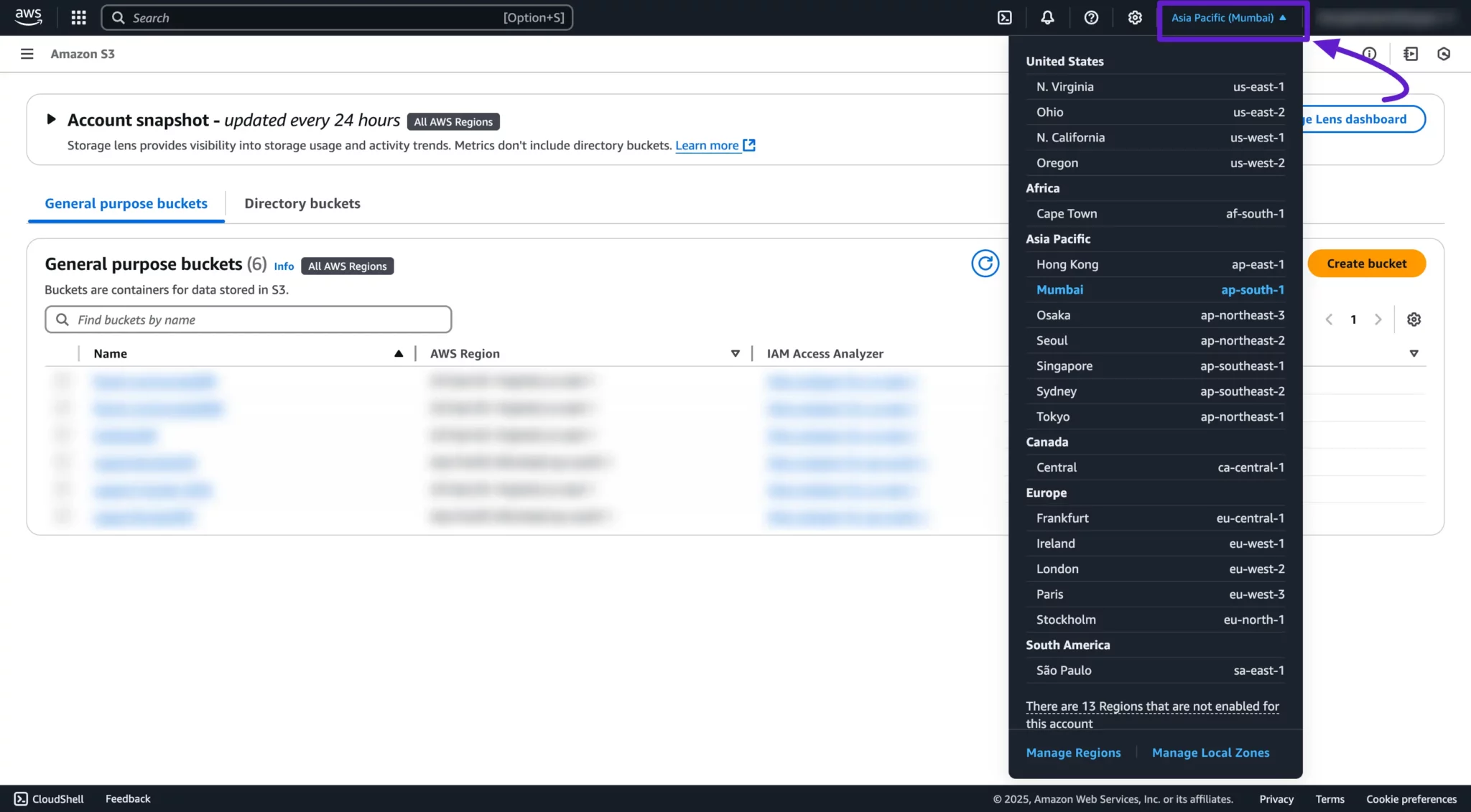 Before creating your bucket, you need to select a region. Amazon S3 creates each bucket in the region you choose, which can help optimize performance, reduce latency, lower costs, or meet data compliance requirements.