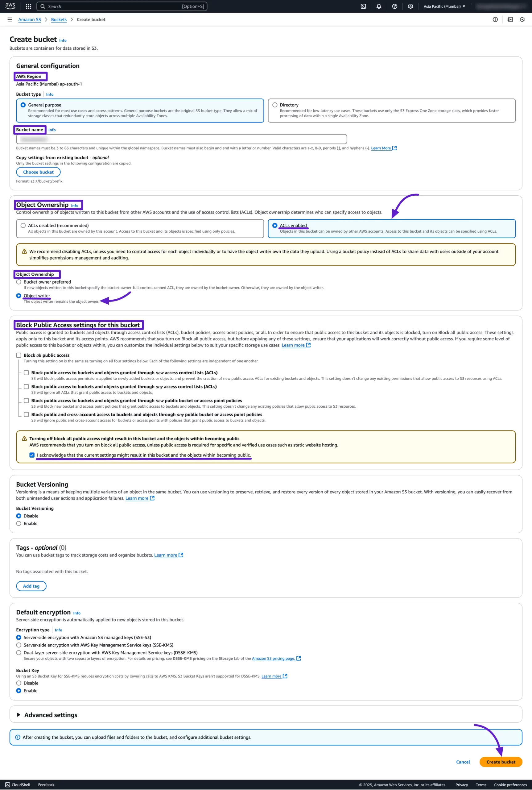 You'll now be redirected to the bucket creation page. Here's how to fill out the form and set the correct permissions: