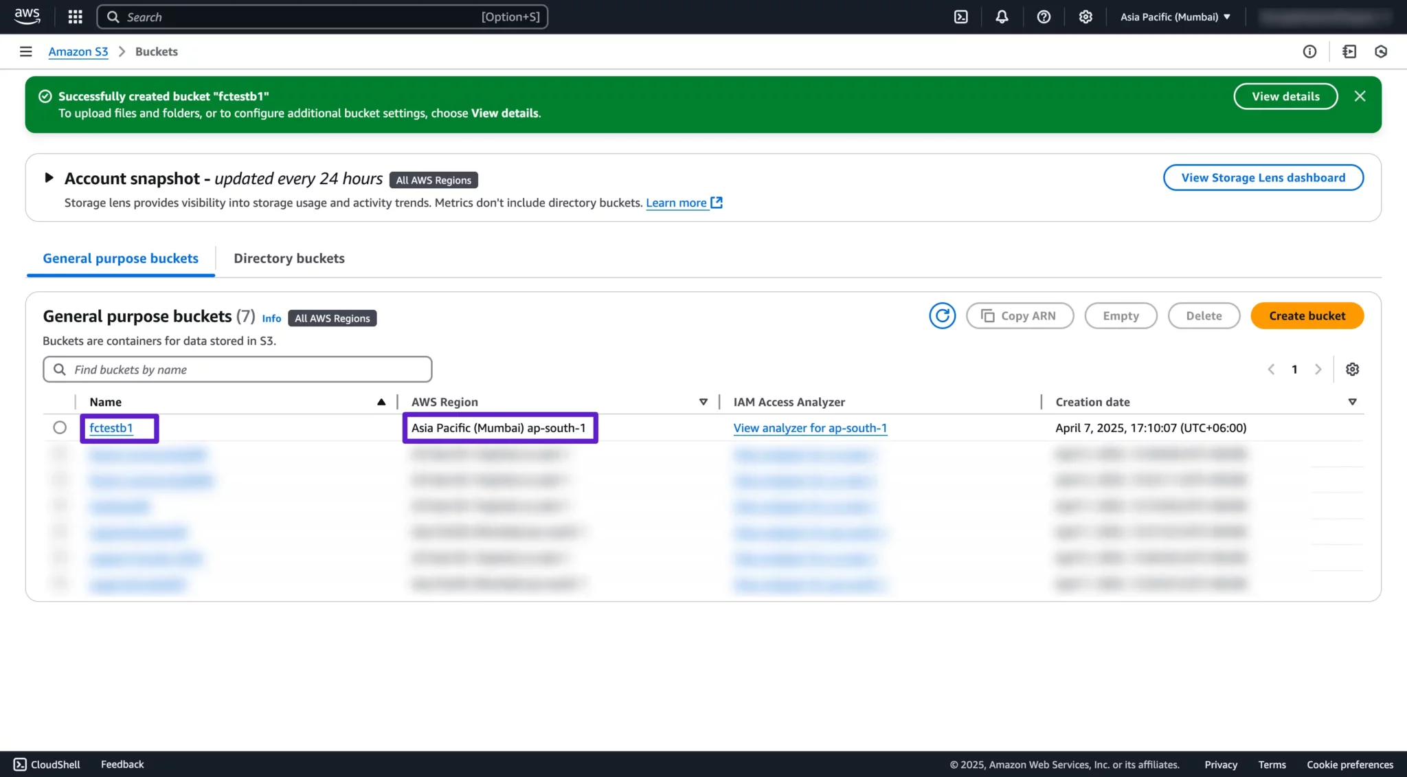 Once your bucket is successfully created, you'll see a confirmation message, and the bucket will appear in your list.