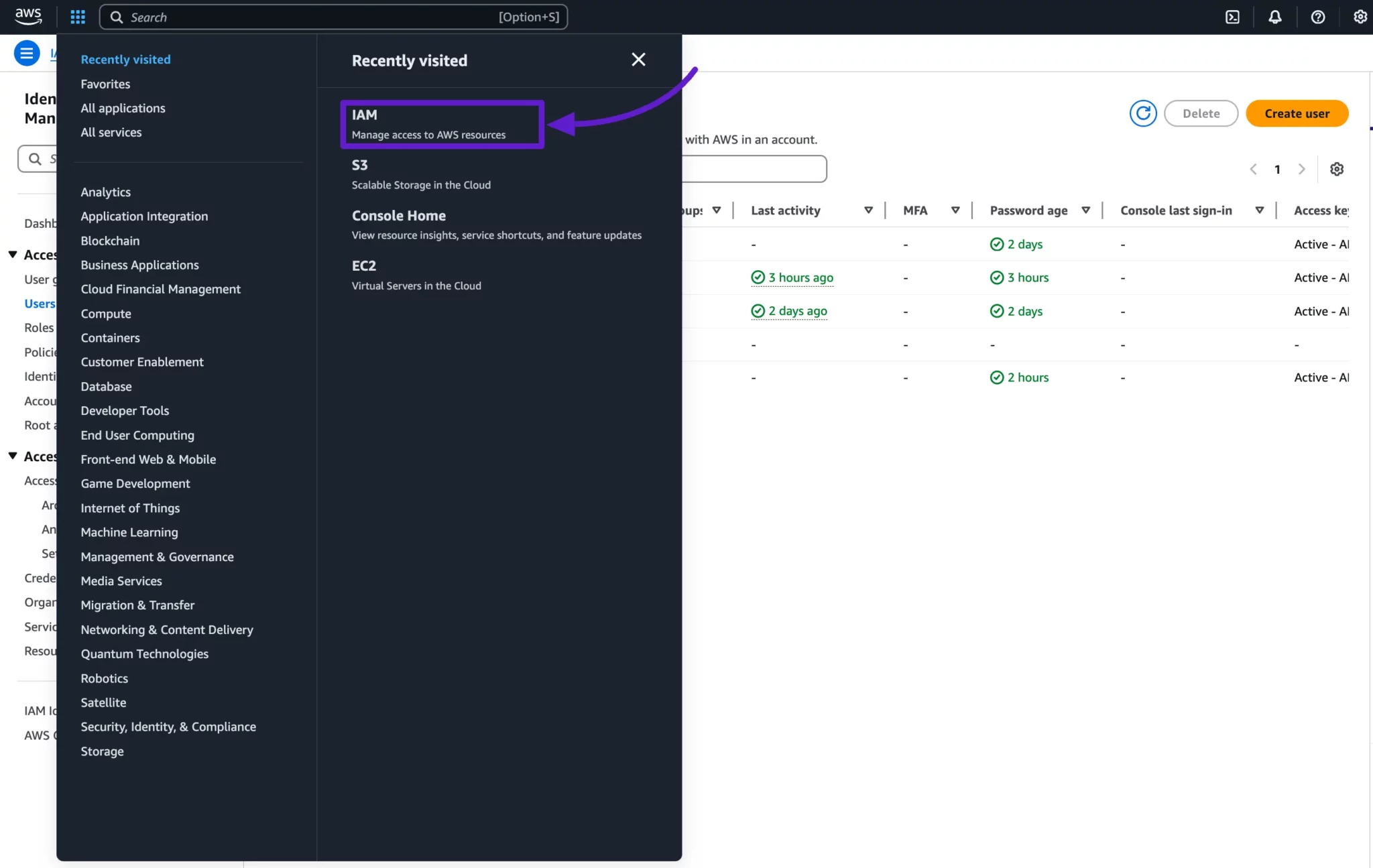 Click the Services dropdown in the AWS navbar or search for IAM. Select IAM to begin creating a new IAM user for access.