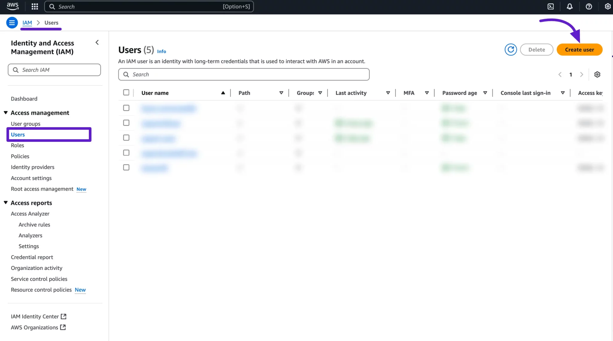 Once you're on the IAM dashboard, click Users from the left sidebar. Then hit the Create User button to start setting up a new IAM user.