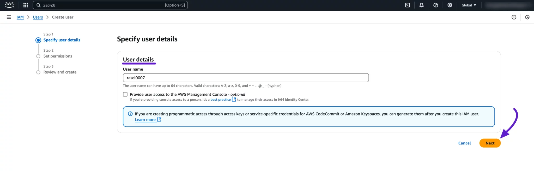 Next, leave the Provide user access to the AWS Management Console (optional) option unchecked, as it's not needed for FluentCommunity integration.