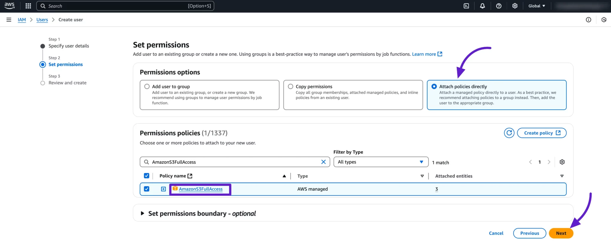 In the Set Permissions step, select Attach policies directly. Then, search for AmazonS3FullAccess in the search bar, select the policy, and click the Next button to proceed.